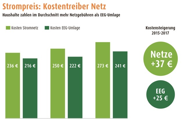 Zum Vergleich: Für die ebenfalls höhere EEG-Umlage fallen im nächsten Jahr 241 Euro netto an. Während die EEG-Kosten seit 2015 um 25 Euro gestiegen sind, zogen die Netzgebühren um 37 Euro an.