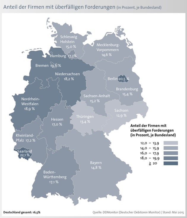 Den deutlichsten Zahlungsverzug haben Unternehmen in Berlin. In der Hauptstadt zahlen die Firmen im Schnitt mit 32,4 Tagen Verspätung. Viele Überfälligkeitstage leisten sich zudem die Unternehmen in Brandenburg (25,8 Tage), Hamburg (23,7 Tage) und Bremen (23,6 Tage). Schneller kommen die Firmen in Bayern an ihr Geld. Unternehmen, die zu spät zahlen, tun dies im Schnitt 18,7 Tage zu spät. In Hessen waren es 19,7 Tage und in Schleswig-Holstein 19,8 Tage.