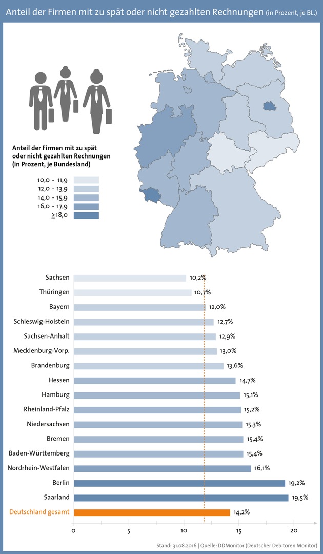 Das schlechteste Zahlungsverhalten zeigten im August 2016 Unternehmen aus dem Saarland. Hier lag die Quote von zu spät oder nicht bezahlten Rechnungen bei 19,5 Prozent. Ebenfalls hohe Werte gab es in Berlin (Spät-oder Nichtzahlerquote von 19,2 Prozent) und in Nordrhein-Westfalen (16,1 Prozent). Die beste Zahlungsmoral haben Unternehmen in Sachsen, wo nur etwa 10 von 100 Firmen die Rechnungen verspätet oder gar nicht bezahlen (Spät- oder Nichtzahlerquote von 10,2 Prozent). Auch in Thüringen (10,7 Prozent), Bayern (12 Prozent), Schleswig-Holstein (12,7 Prozent), Sachsen-Anhalt (12,9 Prozent), Mecklenburg-Vorpommern (13 Prozent) und Brandenburg (13,6 Prozent) zahlen die Unternehmen besser als im bundesweiten Vergleich.