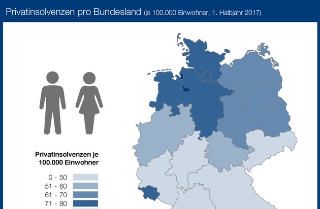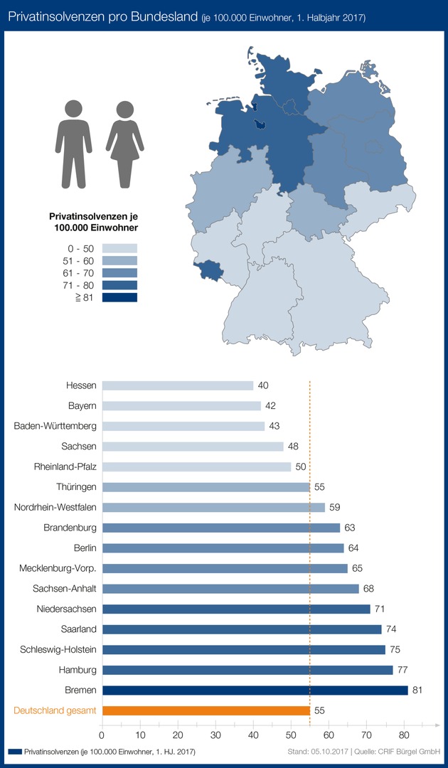 Bremen, Hamburg und Schleswig-Holstein gehören im 1. Halbjahr 2017 zu den Insolvenzhochburgen in Deutschland. Im bundesweiten, relativen Vergleich gab es in Bremen mit 81 Fällen je 100.000 Einwohner die meisten Verbraucherinsolvenzen. Es folgen mit Hamburg (77 Privatinsolvenzen je 100.000 Einwohner) und Schleswig-Holstein (75) zwei weitere Bundesländer aus dem Norden Deutschlands. Der Bundesdurchschnitt lag in den ersten sechs Monaten bei 55 Insolvenzen je 100.000 Einwohner. Am wenigsten Privatinsolvenzen meldete in den ersten sechs Monaten Hessen (40 Fälle je 100.000 Einwohner).