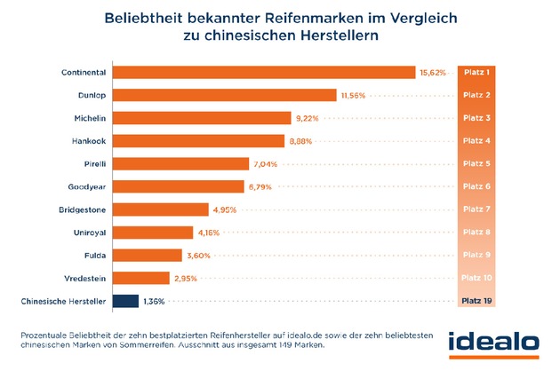 * Premiummarken nach Beliebtheit auf idealo.de: Continental, Dunlop, Michelin, Hankook, Pirelli, Goodyear, Bridgestone, Uniroyal, Fulda, Vredestein. Chinamarken nach Beliebtheit auf idealo.de: GoodRide, Wanli, Sunny, Infinity, Linglong, Sonar, Blackstone, Chengchan, Triangle, Maxxis. ** Stand: 27.02.2015