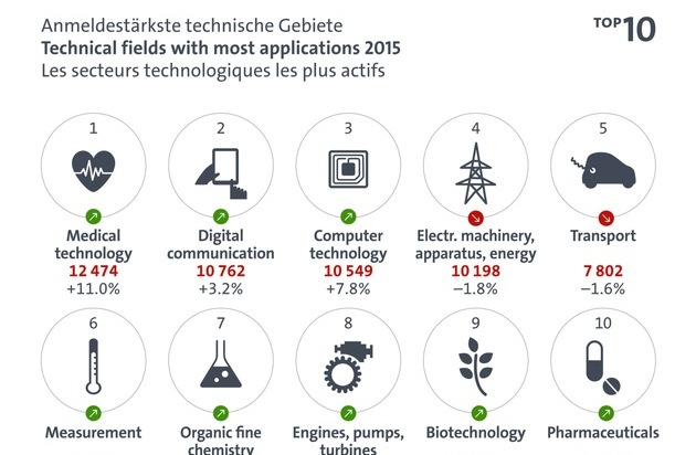Die meisten europäischen Patentanmeldungen beim EPA entfielen 2015 auf die Technologiefelder "Medizintechnik" - hier verzeichnete Deutschland mit 7,8% ebenfalls ein deutliches Anmeldeplus -, "Digitale Kommunikation", "Computertechnologie" sowie "Elektrische Maschinen, Geräte und Energie" (http://ots.de/WzuSJ). Dabei waren deutsche Unternehmen im internationalen Vergleich gerade in den Bereichen "Elektrische Maschinen, Geräte und Energie", "Transport", "Maschinen, Pumpen und Turbinen" (obgleich die Zahlen hier im Vergleich zum Vorjahr zurückgingen) sowie in der "Medizintechnik" und "Messtechnik" besonders anmeldestark.