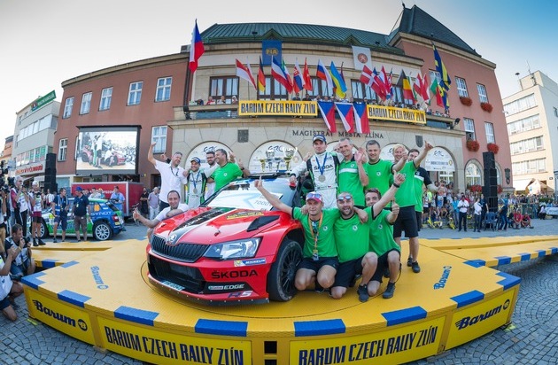 gesamten Teams"Das SKODA Werksduo Jan Kopecky/Pavel Dresler (CZ/CZ) hat die Barum Czech Rally Zlin gewonnen und damit vorzeitig den Titel in der Tschechischen Rallye-Meisterschaft (MCR) verteidigt. Kopecky gewann nach 2004, 2012 und 2015 zum vierten Mal das nationale Championat. Der Routinier blieb in seinem SKODA FABIA R5 in spektakulärer rot-schwarzer Sonderlackierung auch im fünften Saisonlauf der MCR ungeschlagen und setzte sich dabei gegen die europäische Elite durch. Das SKODA Erfolgsteam Kopecky/Dresler lieferte sich über die drei Rallye-Tage ein dramatisches Duell mit Alexey Lukyanuk/Alexey Arnautov (RUS/RUS), die nach einem Unfall auf der letzten Wertungsprüfung alle Chancen einbüßten.