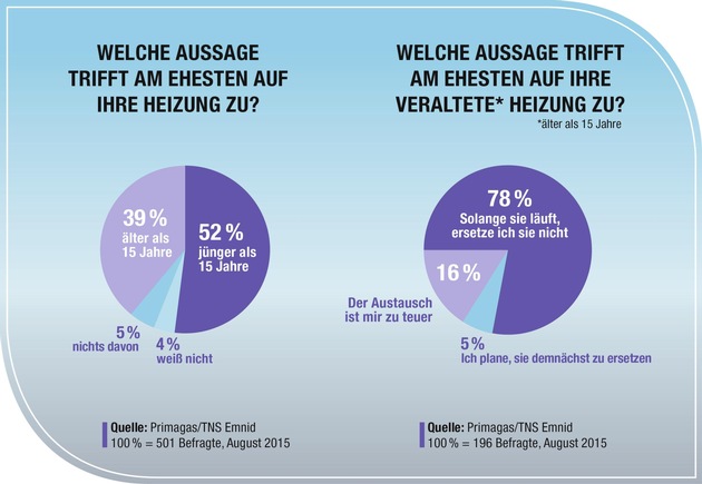 Mindestens 40 Prozent der Heizungen in Deutschland sind älter als 15 Jahre - und damit technisch gesehen veraltet. Das zeigt eine aktuelle Umfrage von TNS Emnid im Auftrag des Energieversorgers Primagas. Die meisten alten Heizungen stehen in den neuen Bundesländern: Hier beträgt der Anteil rund 50 Prozent, in Thüringen und Sachsen sind es sogar 66 Prozent.