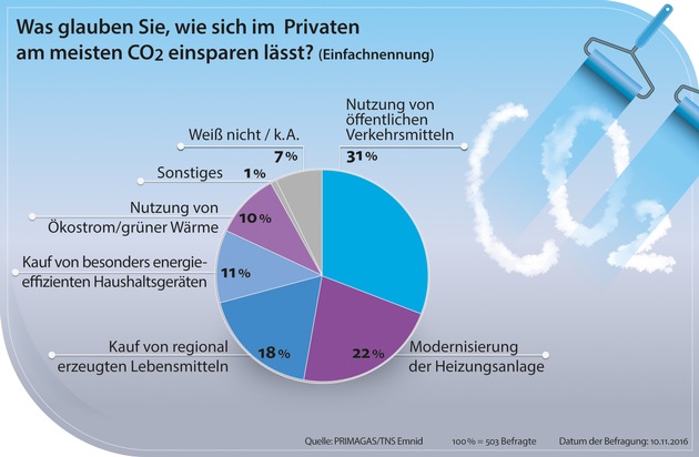 Was glauben Sie, wie sich im Privaten am meisten CO2 einsparen lässt? Das war die Frage, die Kantar Emnid im November im Auftrag des Flüssiggasversorgers Primagas rund 500 Deutschen stellte. 31 Prozent der Umfrageteilnehmer gehen davon aus, dass sie das meiste Kohlendioxid einsparen können, indem sie öffentliche Verkehrsmittel statt des eigenen Autos nutzen. 18 Prozent sind der Meinung, dass sie durch den Kauf von regional erzeugten Lebensmitteln den größten Beitrag leisten. Auf energieeffiziente Haushaltsgeräte setzen elf Prozent, während zehn Prozent das größte Einsparpotenzial bei erneuerbaren Energien und grüner Wärme sehen. 22 Prozent wiederum sind davon überzeugt, dass die Modernisierung der Heizungsanlage das größte CO2-Einsparpotenzial birgt - Platz 2 nach der Nutzung öffentlicher Verkehrsmittel.