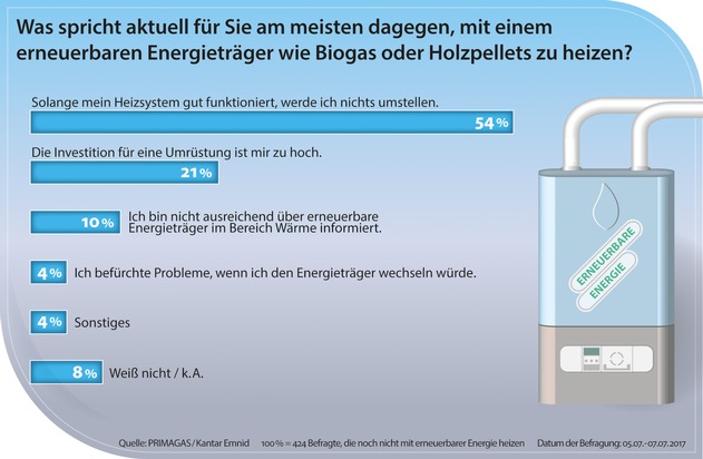 Obwohl die Mehrheit der Deutschen den Ausbau erneuerbarer Energien grundsätzlich befürwortet, ist deren Anteil bei der Wärmeversorgung gering. Eine aktuelle Umfrage von Kantar Emnid unter Hauseigentümern, die noch nicht mit regenerativer Energie heizen, zeigt: Für mehr als jeden Zweiten kommt eine Umstellung auf einen erneuerbaren Brennstoff nicht infrage, solange das bestehende Heizsystem noch intakt ist. Die Angst vor Problemen bei der Umstellung ist kaum ausschlaggebend, so das Ergebnis der vom Flüssiggasversorger Primagas beauftragten Umfrage.
