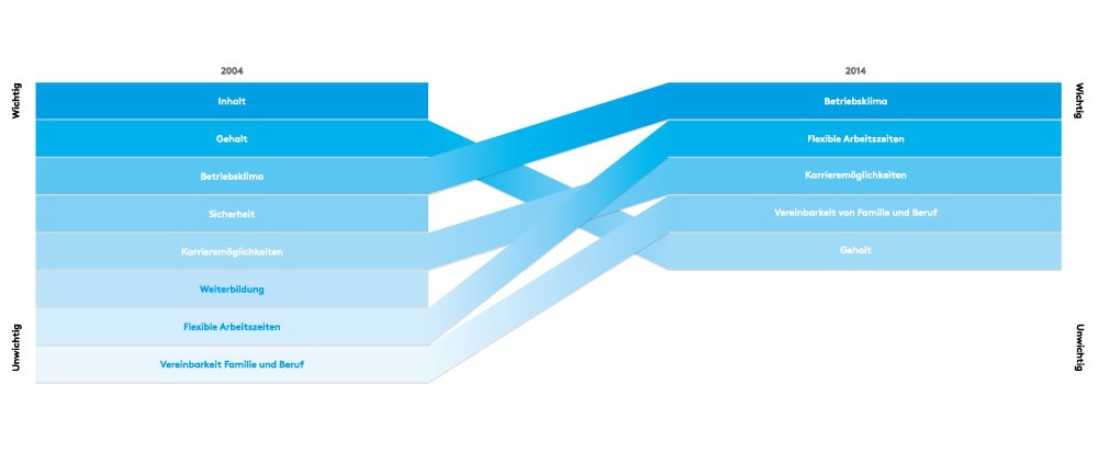 2004 Inhalt der Tätigkeit (68%) Gehalt (64%) Betriebsklima (53%) Karrieremöglichkeiten (38%) Flexible Arbeitszeiten (28%) Vereinbarkeit Familie und Beruf (27%)