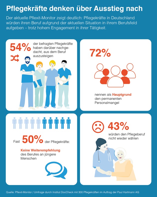 - HARTMANN unterstützt Aufwertung des PflegeberufsMehr als 50 Prozent der Pflegekräfte in Deutschland denken aufgrund der aktuellen Rahmenbedingungen über den Ausstieg aus ihrem Beruf nach. Dies ergab der erstmals durchgeführte Pflexit-Monitor der PAUL HARTMANN AG, Anbieter von Medizin- und Pflegeprodukten. Das Unternehmen unterstützt nun vom 15. bis 17. März 2018 den Deutschen Pflegetag.