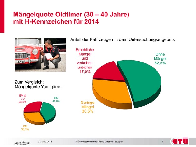 "Auch wenn Oldtimer meist nicht mehr im Alltagsbetrieb eingesetzt werden - und insbesondere bei winterlichen Straßenbedingungen in der Garage bleiben - zeigt diese Entwicklung doch deutlich, dass die Besitzer von Oldtimern mit H-Kennzeichen ihren Fahrzeugen durchaus das zum Erhalt erforderliche Maß an Pflege und Wartung zukommen lassen. Ganz im Gegensatz zu den Haltern vieler im Alltag genutzten Gebrauchsfahrzeuge", betont Rainer Süßbier, Technischer Leiter der GTÜ bei der Vorstellungen des Mängelreports.