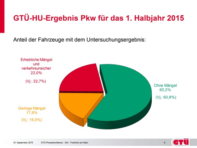 Rund 40 Prozent aller von der GTÜ überprüften Pkw fahren mit sicherheitsrelevanten Mängeln zu Hauptuntersuchung (HU). Fast jedes vierte Auto fällt wegen schwerwiegender Mängel bei der HU durch und erhält im ersten Anlauf keine Prüfplakette. Dies ist das Ergebnis der halbjährlichen HU-Statistik, die die Gesellschaft für Technische Überwachung auf der IAA in Frankfurt vorgestellt hat.