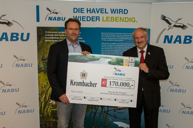 Ein Fluss voller Leben - Die Krombacher Brauerei sorgte mit der Unterstützung des Flussrenaturierungsprojekts, bei dem der Havelaltarm Vehlgaster Dorfhavel wieder an den Hauptstrom der Havel angebunden werden soll, für eine freudige Überraschung beim NABU. Wolfgang Schötz, Leiter Vertriebsmarketing der Krombacher Brauerei, überreichte aktuell einen symbolischen Spendenscheck in Höhe von 170.000 Euro an Olaf Tschimkpe, Präsident des Naturschutzbundes Deutschland e.V.. Bei dem Projekt soll der Altarm "Vehlgaster Dorfhavel" durch den Anschluss an das Hauptfließgewässer zu neuem Leben erweckt werden. Ein weiteres Ziel bei dem Vorhaben ist die Herstellung einer Auenlandschaft und die Verbesserung der Habitationsbedingungen für die Pflanzen- und Tierwelt.