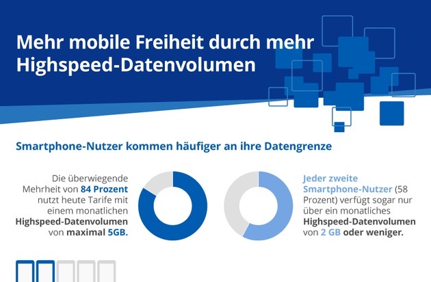 Nach wie vor nutzt hierzulande mehr als jeder zweite Smartphone-Nutzer (58 Prozent) einen Tarif mit einem monatlichen Highspeed-Datenvolumen von 2 GB oder weniger. Jeder zweite Smartphone-Nutzer (52 Prozent) stößt gelegentlich oder regelmäßig an die Grenze seines Datenvolumens.