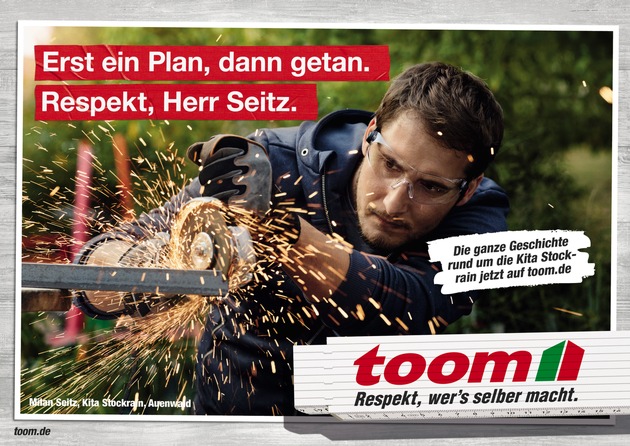 "Auch in diesem Jahr gehen wir mit unserer Marketingkampagne 'Respekt, wer's selber macht' unseren eingeschlagenen, erfolgreichen Weg weiter und schärfen unser Profil als kompetenter Partner im Bereich Selbermachen. Uns ist wichtig, dass im Fokus der Kampagne wieder echte Menschen stehen, die ihre Ärmel hochkrempeln und selber anpacken. Selbermachen macht stolz und bringt Spaß: Wir motivieren und unterstützen Heimwerker und Selbermacher bei der Umsetzung ihrer Projekte und zollen ihnen für ihren Einsatz Respekt und Anerkennung", erläutert René Haßfeld, Geschäftsführer Vertrieb und Marketing bei toom.