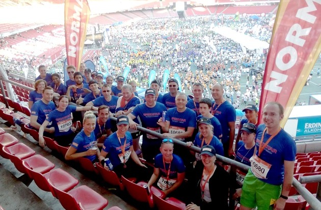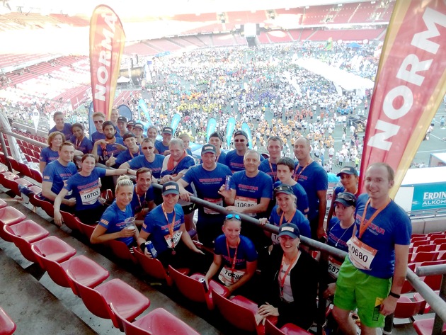 Der Name der erfolgreichen NORMA-Eigenmarke "SPEEDSTAR" motivierte dabei die NORMA-Läufer, trotz Temperaturen weit über 30 Grad Celsius, zu Höchstleistungen. Insgesamt gingen mehr als 17.500 Teilnehmer aus 710 Firmen jeder Größenordnung in der wirtschaftsstarken Metropolregion Nürnberg auf die Strecke, um sich auch 2015 für ihren jeweiligen Arbeitgeber zu präsentieren. Unser Bild zeigt (einen Großteil) der NORMA-Mannschaft direkt nach der gemeinsamen Zielankunft im Nürnberger Grundig-Stadion.