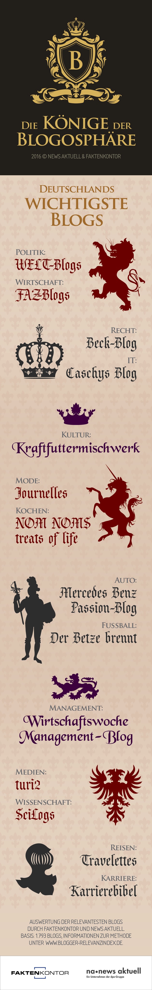 1. Sichtbarkeit im Internet nach SEO-Tool Sistrix 2. Anzahl der Links, die zum jeweiligen Blog führen 3. Vernetzung des Blogs in sozialen Medien 4. Anzahl von Beiträgen innerhalb der letzten drei Monate 5. Anzahl von Kommentaren innerhalb der letzten drei Monate Die wichtigsten deutschen Blogs (inklusive Links): Politik: WELT-Blogs http://www.welt.de/debatte/weblogs Wirtschaft: FAZ-Blogs http://blogs.faz.net Recht: Beck-Blog http://blog.beck.de Kultur: Kraftfuttermischwerk http://www.kraftfuttermischwerk.de IT: Caschys Blog http://stadt-bremerhaven.de Auto: Mercedes Benz Passion-Blog http://blog.mercedes-benz-passion.com Mode: Journelles http://www.journelles.de Fußball: Der Betze brennt http://www.der-betze-brennt.de Kochen: NOM NOMS - treats of life https://nomnomrose.wordpress.com Karriere: Karrierebibel http://karrierebibel.de Wissenschaft: SciLogs http://www.scilogs.de Medien: Turi2 http://www.turi2.de Management: Wirtschaftswoche Management-Blog http://blog.wiwo.de/management Reisen: Travelettes http://www.travelettes.net Datenbasis: 1.793 Blogs aus der Mediendatenbank zimpel (www.zimpel.de) Zeitraum der Untersuchung: November 2015 bis Januar 2016 Untersuchungsmethode: Blogger-Relevanz-Index (www.blogger-relevanzindex.de)