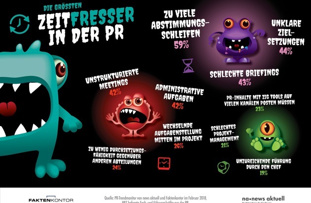 Die größten Zeitfresser in der PR (Top Ten): 1. Zu viele Abstimmungsschleifen 59% 2. Unklare Zielsetzungen 44% 3. Schlechte Briefings 43% 4. Unstrukturierte Meetings 42% 5. Administrative Aufgaben 42% 6. Wechselnde Aufgabenstellung mitten im Projekt 26% 7. Zu wenig Durchsetzungsfähigkeit gegenüber anderen Abteilungen 24% 8. PR-Inhalte mit zig Tools auf vielen Kanälen posten müssen 23% 9. Schlechtes Projektmanagement 21% 10. Unzureichende Führung durch den Chef 19%