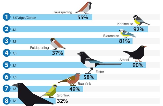 Der Haussperling konnte auch 2018 seinen Platz als häufigster Gast am Futterhaus verteidigen. Unter den Top Ten der häufigsten Wintervögel hat die Amsel am stärksten verloren. Fast ein Drittel weniger Amseln als im Vorjahr wurden beobachtet. Damit rutschte sie von Platz zwei auf Platz fünf ab. "Ein Grund dafür könnte der für diese Vögel tödliche Usutu-Virus sein, der in den Jahren 2016 und 2017 zu Ausbrüchen in immer mehr Teilen Deutschlands geführt hat", so Adrion. "Hier wartet der riesige Datenschatz der Stunde der Wintervögel aber noch auf eine genauere Analyse."