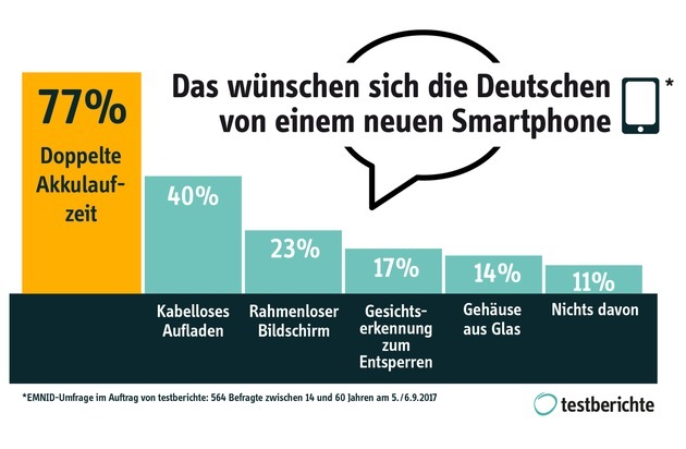 Eine doppelte Akkulaufzeit war mit 77 Prozent das mit Abstand am häufigsten genannte Kriterium, das die Deutschen von einem neuen Smartphone erwarten. Das gilt für alle Altersgruppen, unter den befragten Jugendlichen (14-19 Jahre) wünschen sich sogar fast 90 Prozent eine bessere Ausdauer ihres Handys.