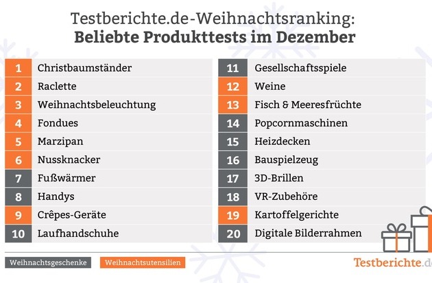 Das Verbraucherportal Testberichte.de (www.testberichte.de) hat untersucht, welche Produkttests besonders im Weihnachtsmonat Dezember auf starkes Nutzerinteresse stoßen.