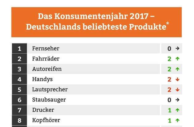 Aufsteiger des Jahres sind die TV-Receiver, die gleich um 13 Plätze nach oben sprangen (auf Platz 12). Grund hierfür ist der seit diesem Jahr gültige neue Standard für terrestrisches Fernsehen DVB-T2, das viele älteren Fernseher nicht ohne einen modernen Receiver empfangen können. Ganz anders erging es den Tablets, die aus den Top 20 herausfielen und um 17 Ränge auf den 31. Platz abstürzten. Offensichtlich ist für diese Produktgattung zwischen kompakten Laptops und größer werdenden Smartphones immer weniger Platz.