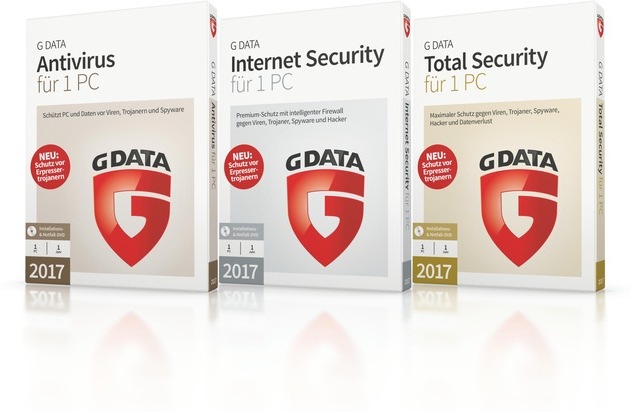 Die Angriffe durch Ransomware haben in diesem Jahr deutlich zugenommen. Der Einsatz von Verschlüsselungstrojanern, wie CryptoLocker, Locky und Co., hat sich für Online-Kriminelle zu einem äußerst profitablen Geschäftsmodell entwickelt. Laut Ermittlungsbehörden waren weltweit Millionen Anwender betroffen. Mit der neuen G DATA Anti-Ransomware-Technologie haben Verschlüsselungstrojaner keine Chance mehr. Signaturunabhängig und in Echtzeit wird die Verschlüsselung durch Computerschädlinge verhindert. In puncto Datensicherheit geht G DATA bei seinen Premium-Lösungen Internet Security und Total Security noch einen Schritt weiter: Privatanwendern stehen zukünftig 5 GB Speicher auf deutschen Cloud-Servern zur automatischen Sicherung ihrer persönlichen Daten zur Verfügung. G DATA Antivirus 2017, Internet Security 2017 und Total Security 2017 sind Ende Oktober 2016 im Handel verfügbar.