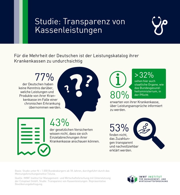 Für die Studie "Transparenz von Kassenleistungen" wurden in einer für die deutsche Bevölkerung repräsentativen Umfrage 1.000 Bundesbürger ab 18 Jahren online befragt. Die Daten sind durch das Marktforschungsinstitut Toluna im Auftrag des IMWF Institut für Management- und Wirtschaftsforschung und mit Unterstützung der Coloplast GmbH erhoben worden. Die Ergebnisse sind auf ganze Zahlen gerundet.
