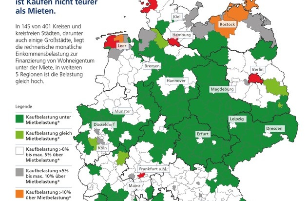 Doch es gibt auch Regionen, in denen Mieten teurer ist als eine Immobilienfinanzierung. Dies ist in 145 Kreisen und kreisfreien Städten der Fall, wenn man die prozentuale Differenz auf eine Nachkommastelle rundet. Die größten finanziellen Vorteile beim Kauf bieten ostdeutsche Regionen. In weiteren fünf Kreisen sind die Wohnkosten für Eigentümer und Mieter gleich hoch. Da bei der Miete kein Vermögen aufgebaut wird, kommen Käufer rechnerisch in über 37 Prozent der Kreise besser weg. "Wer allerdings in strukturschwachen Regionen kaufen will, sollte das Objekt besonders sorgfältig prüfen und im Hinterkopf behalten, dass Wertverluste eintreten können", sagt Jörg Koschate, Vorstand Produkte der BHW Bausparkasse. Auch sollten sich Käufer vom Sanierungsstand überzeugen und sicherstellen, dass keine kostspieligen Renovierungen ins Haus stehen. "Wer aber seinen Lebensmittelpunkt gefunden hat, der darf seine Traumimmobilie ruhig kaufen. Nicht nur kann das günstiger sein als Mieten, auch sind Eigentümer unabhängig von Mieterhöhungen und profitieren - wenn die Immobilie abbezahlt ist - von mietfreiem Wohnen im Alter."