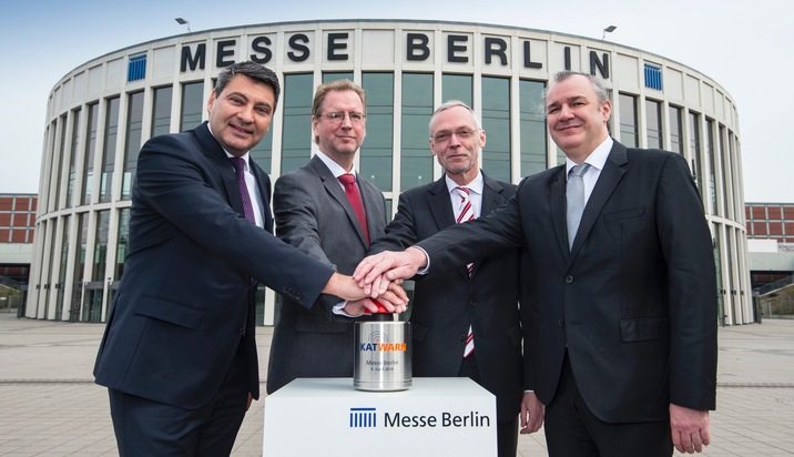 Heute hat die Messe Berlin GmbH als erste Messegesellschaft in Deutschland das Warn- und Informationssystem KATWARN für das Berliner Messegelände freigeschaltet. Bernd Krömer, Staatssekretär in der Senatsverwaltung für Inneres und Sport des Landes Berlin, Prof. Dr. Manfred Hauswirth, Leiter des Fraunhofer-Instituts für Offene Kommunikationssysteme FOKUS in Berlin, Frank A. Werner, Vorstand der Feuersozietät Berlin Brandenburg, sowie Thomas Wilke, Bereichsleiter Event Services der Messe Berlin GmbH, drückten um 12 Uhr auf den symbolischen roten Startknopf.