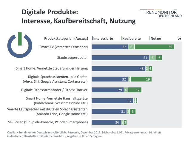 Dies zeigt die aktuelle Ausgabe des «Trendmonitor Deutschland» des Marktforschungsinstituts Nordlight Research. Über 1.000 Verbraucher ab 14 Jahren mit Zugang zum Internet wurden im November 2017 repräsentativ zu Kenntnis, Interesse, Kaufbereitschaft und Nutzung aktueller Trendprodukte und innovativer Services befragt.