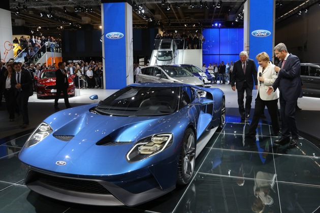 Bundeskanzlerin Angela Merkel und der Hessische Ministerpräsident Volker Bouffier haben während eines IAA-Messerundgangs am Donnerstagvormittag, 17. September 2015, den Ford Stand besucht. Sie ließen sich von Bernhard Mattes, Vorsitzender der Geschäftsführung der Ford-Werke GmbH, das Konzept des Supersportwagens Ford GT erläutern. Innovation durch Performance - unter diesem Motto ist der Ford GT das technologische Spitzenmodell für extremen Leichtbau, funktionelle Aerodynamik und EcoBoost-Motorentechnologie.