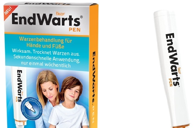 Ab April ist ein neuer Warzenstift zur einfachen und schmerzfreien Entfernung von Warzen rezeptfrei in der Apotheke erhältlich: der EndWarts® PEN* enthält Ameisensäure, die nur einmal wöchentlich mittels des praktischen Stifts (Pen) punktgenau auf die Warze aufgetragen wird. Der Wirkstoff Ameisensäure hilft dem Körper die Warze von innen auszutrocknen und abzustoßen. Da die sekundenschnelle Anwendung in der Regel keine Schmerzen verursacht, ist der neue Pen nicht nur für Erwachsene, sondern auch zur Warzenentfernung bei Kindern empfehlenswert (vor der Behandlung von Kindern unter 4 Jahren sollte der Haus- oder Kinderarzt konsultiert werden).