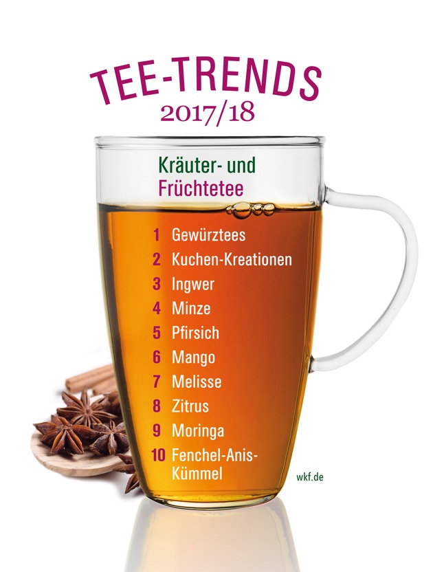 "Interessanterweise erwarten wir - wie in der aktuellen Mode - im Bereich der Früchtetees eine Nachfrage nach Geschmackssorten in der Trend-Farbe Goldgelb", weiß Dr. Monika Beutgen, Geschäftsführerin der Wirtschaftsvereinigung Kräuter- und Früchtetee e.V., zu berichten. "Hatte es Pfirsich 2016 gerade noch unter die Top Ten geschafft, so ist er auf Platz fünf vorgerutscht, gefolgt von den gleichfarbigen Neueinsteigern Mango und Zitrus."
