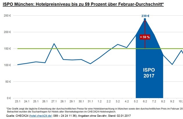 Zur ISPO ziehen die Preise für eine Hotelübernachtung in einem Umkreis von fünf Kilometern zur Messe deutlich an. Messebesucher zahlen für ein Zimmer gleicher Kategorie (06. bis 07. Februar) im identischen Hotel durchschnittlich das Dreifache (plus rund 200 Prozent oder 170 Euro pro Nacht), in der Spitze sogar 365 Prozent (plus 288 Euro pro Nacht) mehr als eine Woche später.