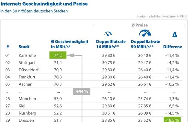 Im Schnitt der 30 größten deutschen Städte kostet eine Doppelflatrate mit einer Geschwindigkeit von mindestens 50 MBit/s im Januar 2017 rund neun Prozent weniger als langsamere Tarife mit nur 16 MBit/s.