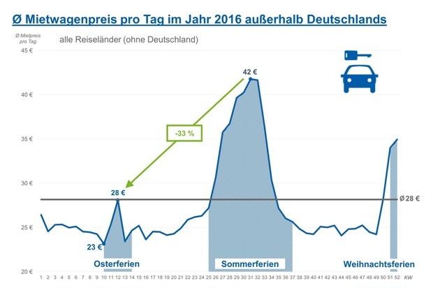 Schnitt für 19 Euro pro TagIn den Osterferien zahlen Urlauber deutlich weniger für ihren Mietwagen als zu anderen beliebten Reisezeiten: In Urlaubsländern kostet ein Leihauto zu Ostern durchschnittlich 28 Euro pro Tag und damit ein Drittel weniger als in den Sommerferien (42 Euro pro Tag).*