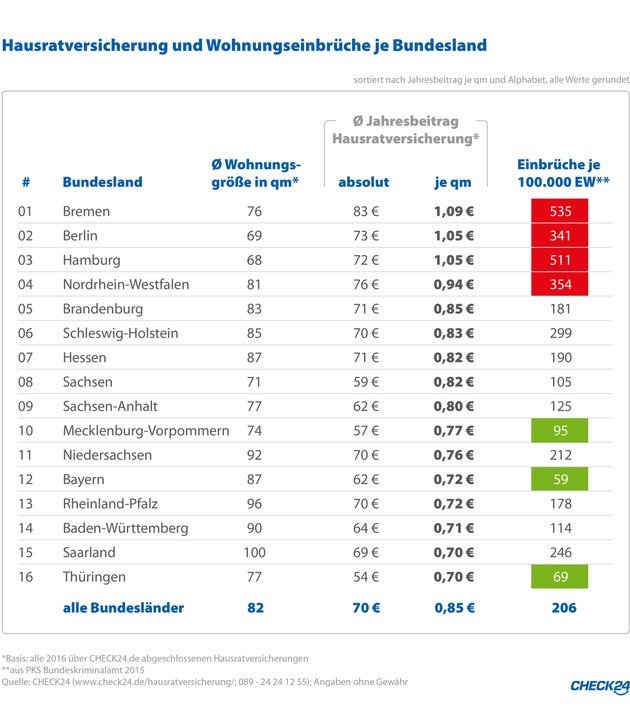 Nürnberg günstigBremer haben 2016 am meisten für eine Hausratversicherung gezahlt. Gleichzeitig ist Bremen im Verhältnis zur Einwohnerzahl das Bundesland mit den meisten polizeilich registrierten Wohnungseinbrüchen.1) Auch in Hamburg, Berlin und Nordrhein-Westfalen ist die Zahl der Einbrüche hoch und die Hausratversicherung, die u. a. für Einbruchschäden aufkommt, überdurchschnittlich teuer.