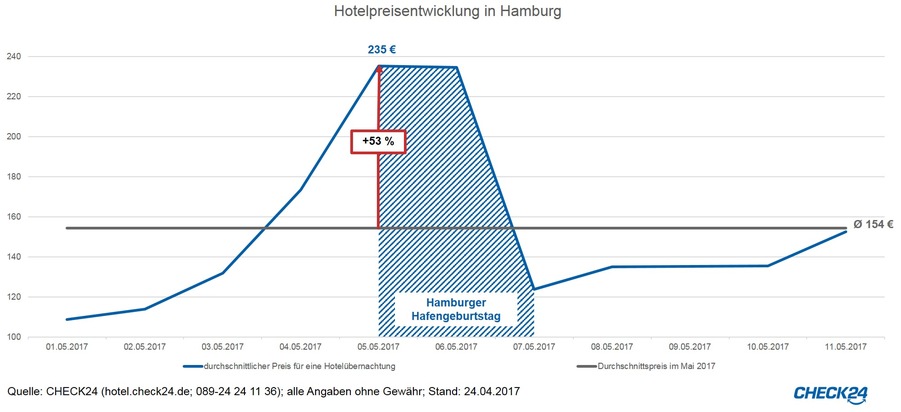 *)Allgemeine Suchkriterien: min. drei Sterne, min. sieben von zehn Punkte in der Kundenbewertung auf CHECK24.de, max. zwei Kilometer Luftlinie vom Jungfernstieg, 20354 Hamburg entfernt, Übernachtungszeitraum Hafengeburtstag: Freitag, 05. bis Samstag, 06. Mai 2017, Vergleichszeitraum: Freitag, 12. bis Samstag, 13. Mai 2017; Stand der Hotelpreise: 19.04.2017; alle in der Pressemeldung genannten Hotelpreise gelten pro Nacht im Doppelzimmer (ein Zimmer, zwei Erwachsene). Tabellen verfügbar unter http://ots.de/GpEVi.