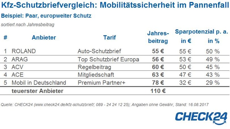 Der Anbietervergleich lohnt sich: Ein Paar, das sich für einen europaweiten Schutz entscheidet, spart im Beispiel bis zu 50 Prozent der Kosten. Die Absicherung kostet beim günstigsten Anbieter 55 Euro im Jahr, beim teuersten 110 Euro.