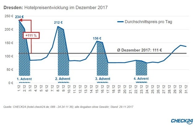 Am deutlichsten fallen die Preissteigerungen zum berühmten Striezelmarkt in Dresden aus. An den Adventswochenenden klettern die Preise im CHECK24 Hotel-Vergleich auf bis zu 111 Prozent über den Durchschnittspreis im Dezember 2017. Auch in Erfurt (66 Prozent), Dortmund (60 Prozent), Nürnberg und Bremen (je 43 Prozent) steigen die Hotelpreise in der Vorweihnachtszeit stark.*