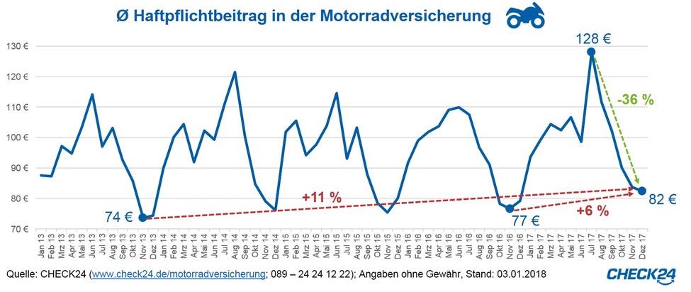 Aktuell kostet die Motorrad-Haftpflichtversicherung im Schnitt 82 Euro pro Jahr und ist damit sechs Prozent teurer als zum günstigsten Zeitpunkt im Vorjahr. Im Vergleich zum Jahrestief 2013 ist der durchschnittliche Haftpflichtbeitrag elf Prozent gestiegen.