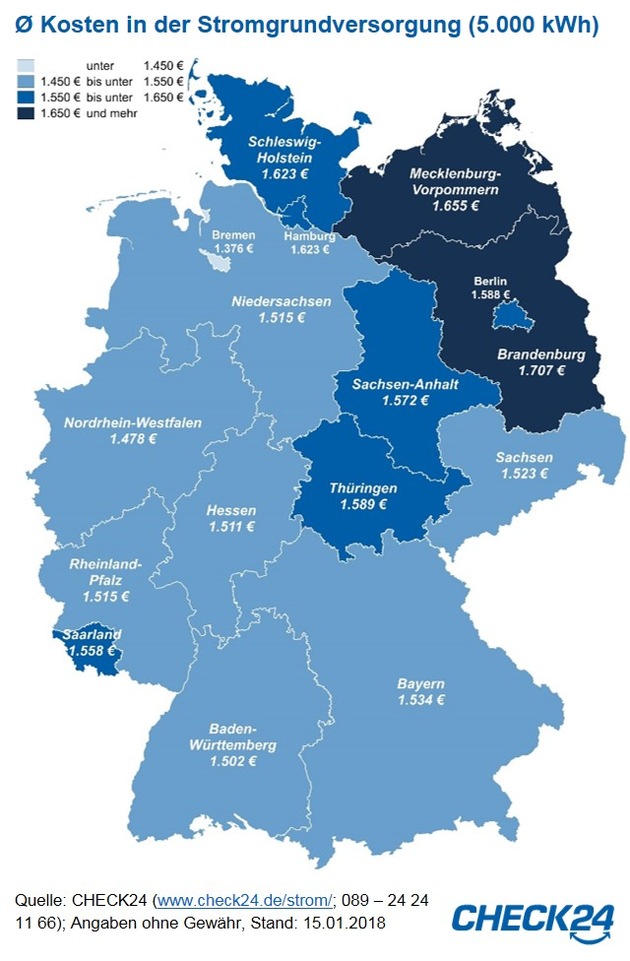 Auch in Mecklenburg-Vorpommern (1.655 Euro), Schleswig-Holstein und Hamburg (je 1.623 Euro) ist Strom aus der Grundversorgung vergleichsweise teuer. Im Bundesdurchschnitt werden 1.526 Euro fällig. Die Stromkosten sind in Ostdeutschland etwas höher als im Westen der Republik. Im Januar 2018 kosteten 5.000 kWh Strom in den östlichen Bundesländern im Durchschnitt 1.594 Euro und damit 80 Euro bzw. fünf Prozent mehr als in westlichen (1.514 Euro).