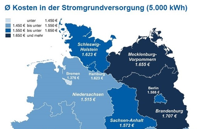 In Bremen ist Strom deutschlandweit am günstigsten. Ein Vierpersonenhaushalt mit einem Jahresverbrauch von 5.000 kWh zahlt dort in der Grundversorgung durchschnittlich 1.376 Euro. Für Verbraucher aus Brandenburg kostet die gleiche Menge Strom 1.707 Euro - 331 Euro bzw. 24 Prozent mehr.*)