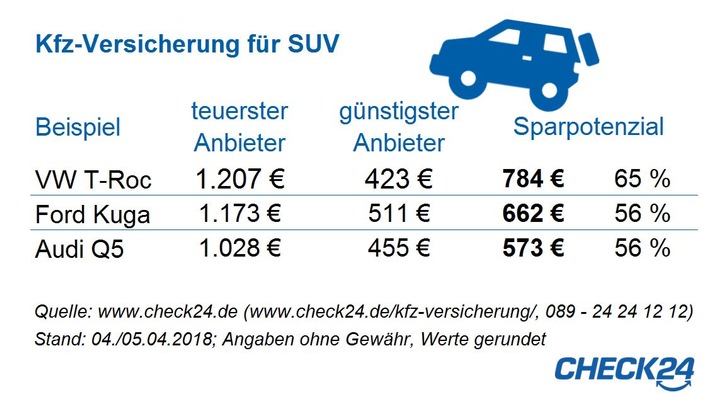 Die Kfz-Versicherung für einen SUV ist oft teurer als für Kompakt- oder Mittelklasse-Pkw. Umso größer ist das Sparpotenzial durch einen Vergleich verschiedener Tarife. Beispielrechnungen für vollkaskoversicherte SUV zeigen, dass der Anbietervergleich die jährlichen Kosten für die Kfz-Versicherung um bis zu 784 Euro reduziert.