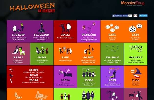 Die interaktive Echtzeitvisualisierung von Monsterzeug.de macht die interessantesten Zahlen und Daten zu Halloween erlebbar. Halloween in Echtzeit (https://www.monsterzeug.de/Halloween-in-Echtzeit) zeigt auf einen Blick, was rund um den Tag des Schreckens innerhalb von 1 Sekunde in Deutschland, Österreich und der Schweiz passiert. Wer zieht gerade welches Kostüm an, wie viele Kürbisse werden gerade ausgehöhlt und wie viele Menschen sich dank der gruseligen Verkleidungen anderer erschrecken?