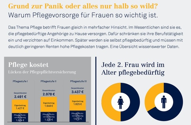 "Pflegebedürftigkeit?" Zu oft noch kein Thema, doch die heute 40- bis 50-jährigen Frauen merken allmählich, dass sie dieser Frage nicht länger aus dem Weg gehen sollten. Meist sind es zuerst die Eltern, die pflegebedürftig werden und um die sie sich kümmern müssen. Als Nächstes, so die Prognosen der Experten, der eigene Partner. Und irgendwann werden auch sie selbst mit hoher Wahrscheinlichkeit davon betroffen sein. Das wiegt umso schwerer, denn die Kinder sind dann längst aus dem Haus und das Alterseinkommen reicht häufig nicht aus, um die Pflegekosten zu decken. Und die gesetzliche Pflegepflichtversicherung trägt auch in Zukunft nur einen Teil davon.