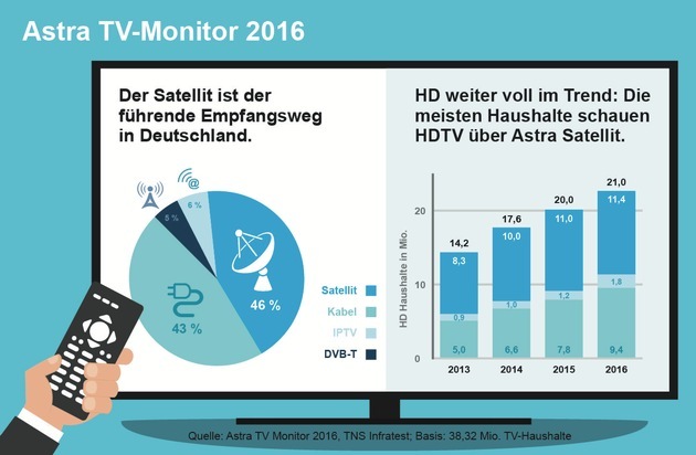 Laut aktuellem Astra TV-Monitor* 2016 ist der Satellit die reichweitenstärkste TV-Infrastruktur in Deutschland: 46 Prozent (17,6 Mio.) der 38,3 Millionen TV-Haushalte in Deutschland empfangen ihre Programme über Satellit. Dahinter folgt der Fernsehempfang via Kabel mit 43 Prozent (16,6 Mio.). Das digitale Antennenfernsehen DVB-T kommt auf einen Marktanteil von 5 Prozent (1,8 Mio.), das lineare Internetfernsehen IPTV liegt bei 6 Prozent (2,3 Mio.).