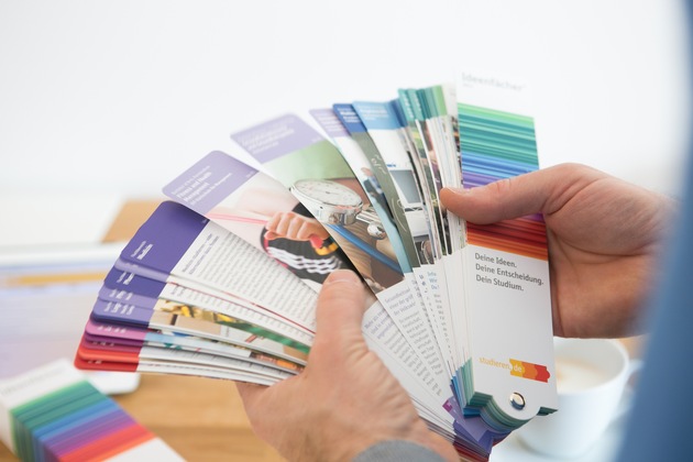 Aufgrund der großen Nachfrage erscheint der Ideenfächer 2017 in doppelter Auflage. Bestellungen sind ab sofort direkt bei www.studieren.de möglich. Für die Beratung, Seminare oder Workshops zur Studienorientierung erhalten Lehrkräfte und Studienberater den Ideenfächer kostenfrei. "Anfragen im letzten Jahr haben uns gezeigt, dass viele Schüler gerne einen eigenen Ideenfächer hätten", weiß Marion Völker von studieren.de. Privatpersonen können den Ideenfächer deshalb dieses Jahr erstmals auch kostenpflichtig bestellen. Link: https://studieren.de/ideenfaecher.0.html