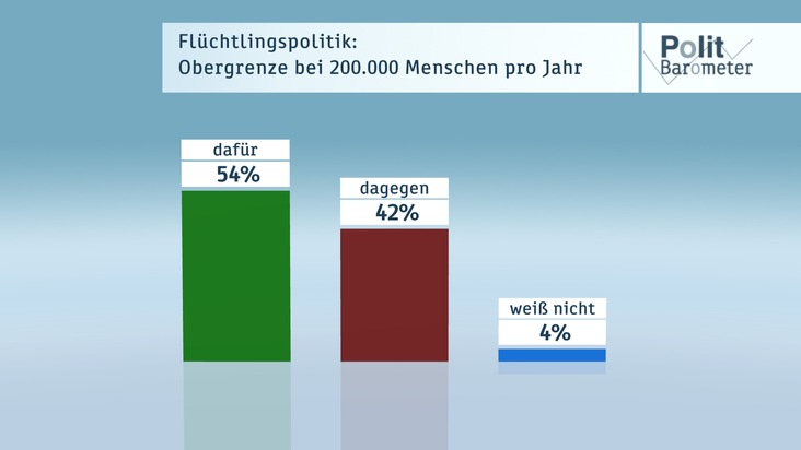 Die Umfrage zum Politbarometer wurde wie immer von der Mannheimer Forschungsgruppe Wahlen durchgeführt. Die Interviews wurden in der Zeit vom 20. bis 22. September 2016 bei 1.241 zufällig ausgewählten Wahlberechtigten telefonisch erhoben. Die Befragung ist repräsentativ für die wahlberechtigte Bevölkerung in Deutschland. Der Fehlerbereich beträgt bei einem Anteilswert von 40 Prozent rund +/- drei Prozentpunkte und bei einem Anteilswert von 10 Prozent rund +/- zwei Prozentpunkte. Daten zur politischen Stimmung: CDU/CSU: 34 Prozent, SPD: 22 Prozent, Linke: 10 Prozent, Grüne: 14 Prozent, FDP: 5 Prozent, AfD: 13 Prozent. Das nächste Politbarometer sendet das ZDF am Freitag, 14. Oktober 2016. Weitere Informationen zur Methodik der Umfrage und zu den genauen Frageformulierungen finden Sie auch auf