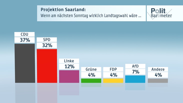 Wenn schon am nächsten Sonntag gewählt würde, dann ergäben sich die folgenden Projektionswerte für die Parteien: Die CDU käme zurzeit auf 37 Prozent, die SPD auf 32 Prozent, die Linke auf 12 Prozent, die Grünen auf 4 Prozent, die FDP auf 4 Prozent und die AfD auf 7 Prozent. Die anderen Parteien, darunter auch die Piraten, kämen zusammen auf 4 Prozent.