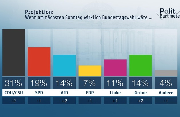 In der Woche der Koalitionsverhandlungen verlieren sowohl Union als auch SPD an Zustimmung. Wenn am nächsten Sonntag wirklich Bundestagswahl wäre, käme die CDU/CSU nur noch auf 31 Prozent (minus 2) und die SPD fiele mit 19 Prozent (minus 1) erneut auf ein Rekordtief. Die AfD könnte dagegen deutlich zulegen auf 14 Prozent (plus 2), genauso die Grünen, die nach ihrem Parteitag am Wochenende jetzt mit 14 Prozent (plus 2) rechnen könnten. Die FDP würde einen Punkt abgeben auf 7 Prozent, die Linke verbesserte sich auf 11 Prozent (plus 1) und die anderen Parteien lägen zusammen bei 4 Prozent (minus 1).